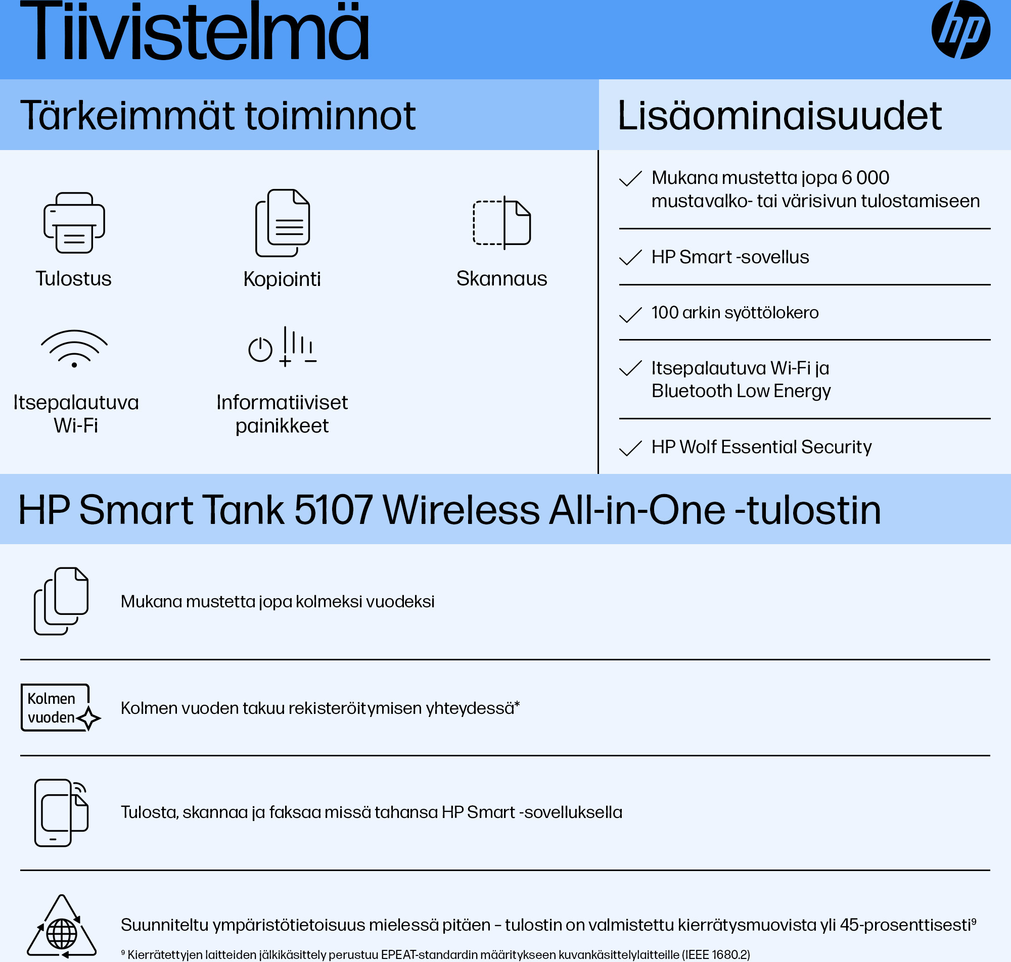 - Myyntipakkauksen sisältö: 5D1B1A: HP Smart Tank 5107 All-in-One -tulostin; HP 32XL alkuperäinen musta mustepullo, 135 ml
