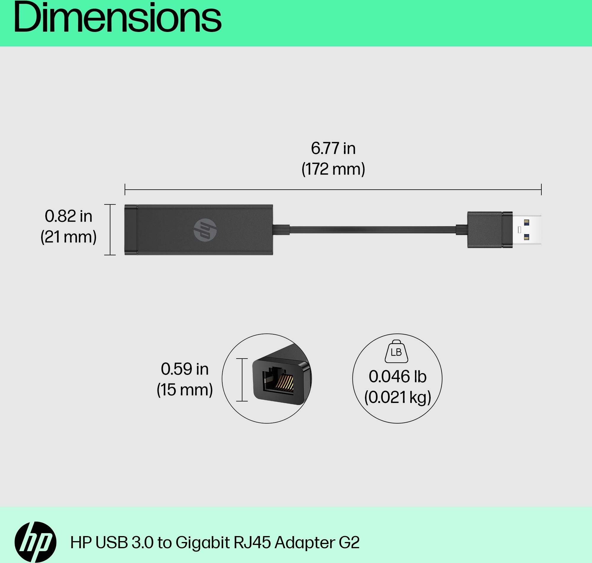 HP:n USB-väylään liitettävä Ethernet-verkkosovitin on kätevä tapa kytkeä lähiverkkoon esimerkiksi kannettava, jossa ei ole erillistä RJ-45 -liitäntää. Tukee 10/100/1000 Mt/s ethernet yhteyksiä.