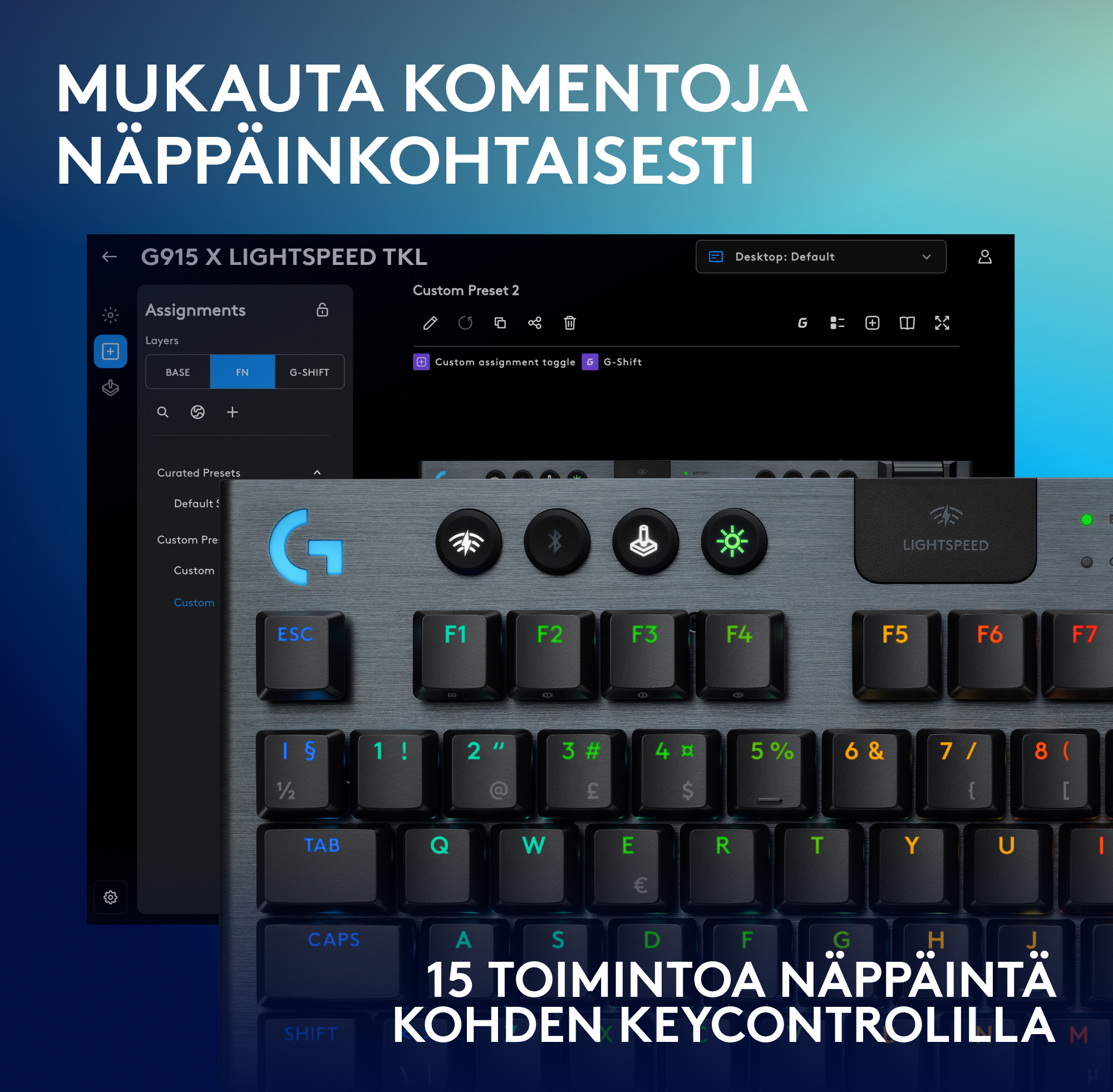 Hallitse peliä omalla tavallasi: Määritä jopa 15 toimintoa näppäintä kohden ja tee langattomasta näppäimistöstä mukautettu komentokeskus KEYCONTROLin avulla.