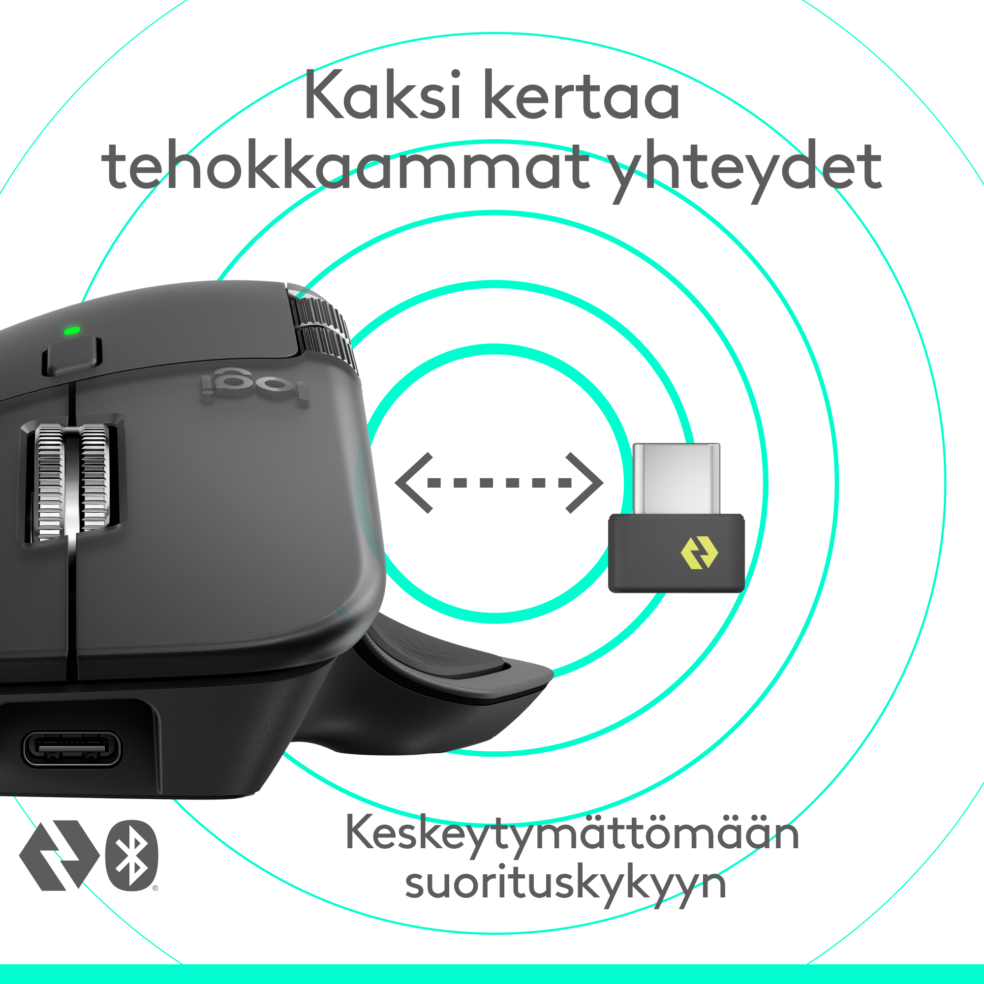 Vieritä 1 000 riviä sekunnissa ja pysähdy pikselintarkasti MagSpeed- vierityspyörällä – Logitechin nopeinta, hiljaisinta ja tarkinta vierittämistä. Nauti kaksi kertaa tehokkaammista yhteyksistä USB- C- sovittimella, edistyksellisellä radiosirulla ja optimoidulla antennilla, jotka takaavat nopeamman, vahvemman ja luotettavan suorituskyvyn – tai voit myös halutessasi käyttää Bluetoothia.