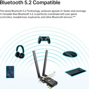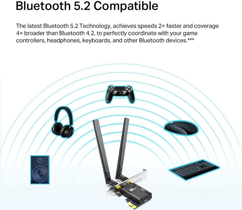 - Pakkauksen sisältö: Archer TX20E WiFi 6-adapteri ja Bluetooth 5.2 -sovitin, bluetooth liitäntä kaapeli, kaksi Dual band antennia, low Profile -takalevy, ajuri-CD / pikaohje.