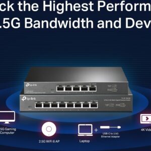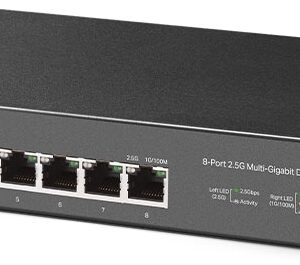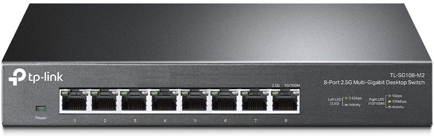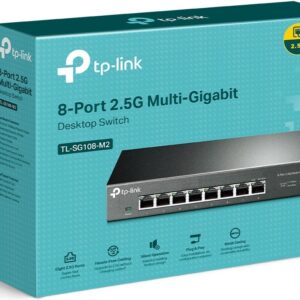 TP-Link TL-SG108-M2 on 8-porttinen 2.5 Gigabitin ethernet kytkin jossa kahdeksan 100 Mbps/ 1 Gbps/ 2.5 Gbps Auto MDI/MDIX RJ-45 porttia. Tällä kytkimellä päivität kodin tai toimiston verkon nopeaan Multi-Gigabit aikaan.